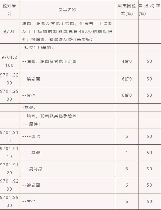 根據(jù)《中華人民共和國(guó)進(jìn)出口稅則(2022版)》,繪畫(huà)作品的稅則號(hào)列和部分稅率如下(協(xié)定稅率及特惠稅率等詳見(jiàn)2022年稅則):