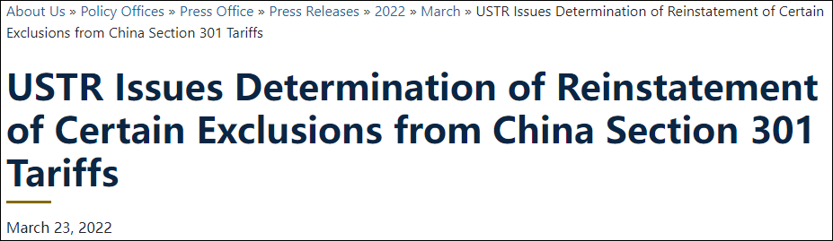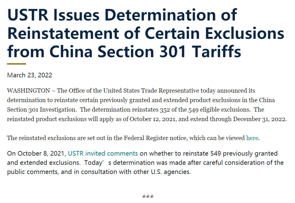 當地時間23日,美國貿易代表辦公室發布聲明,宣布重新豁免對352項從中國進口商品的關稅,該新規定將適用于在2021年10月12日至2022年12月31日之間進口自中國的商品。