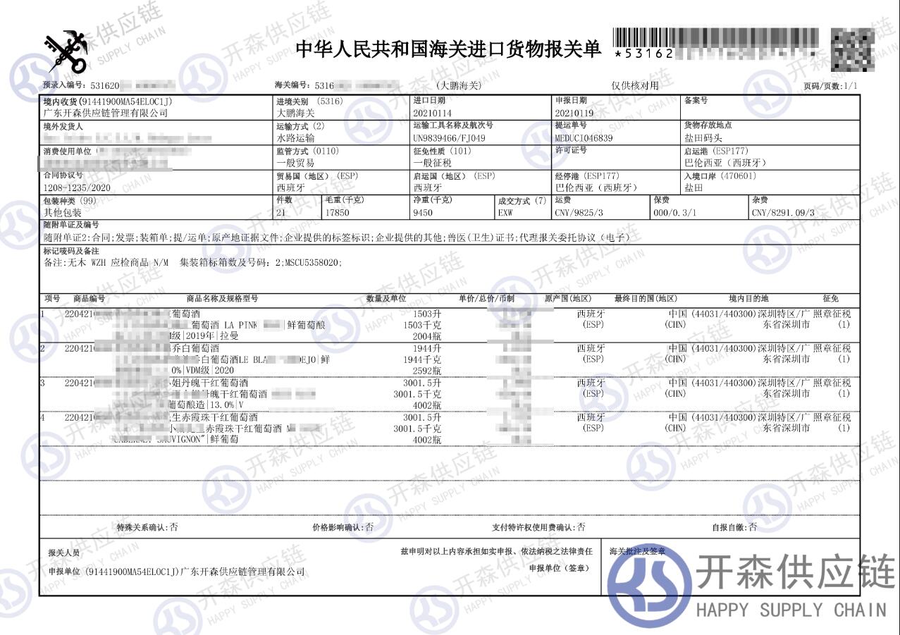 【導(dǎo)讀】您正在閱讀的是關(guān)于【進(jìn)口案例】西班牙葡萄酒進(jìn)口報關(guān)代理服務(wù)的內(nèi)容,本文由開森葡萄酒進(jìn)口報關(guān)代理小編整理編寫;